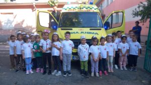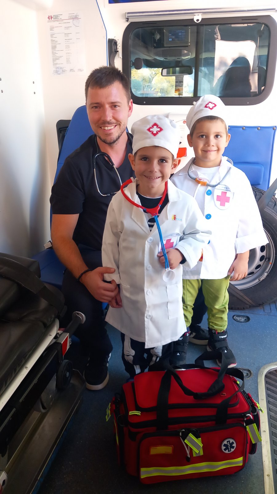 Той показа на децата уредите и инструментите, с които си служи всеки ден, и им разказа за отговорната и благородна професия на лекаря. Най-голямото вълнение настъпи, когато малките „детелинки“ имаха възможност да се качат в истинска линейка със включен звуков и светлинен сигнал – преживяване, което те няма да забравят!