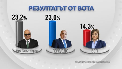 “Тренд” представи 98% от извадката. Според данните “Има такъв народ” печели 23,8% от гласовете, ГЕРБ-СДС – 23,2%, БСП – 13,7%, “Демократична България” – 11,6%, ДПС – 11,0%, , “Изправи се! Мутри, вън!” – 5,2%.