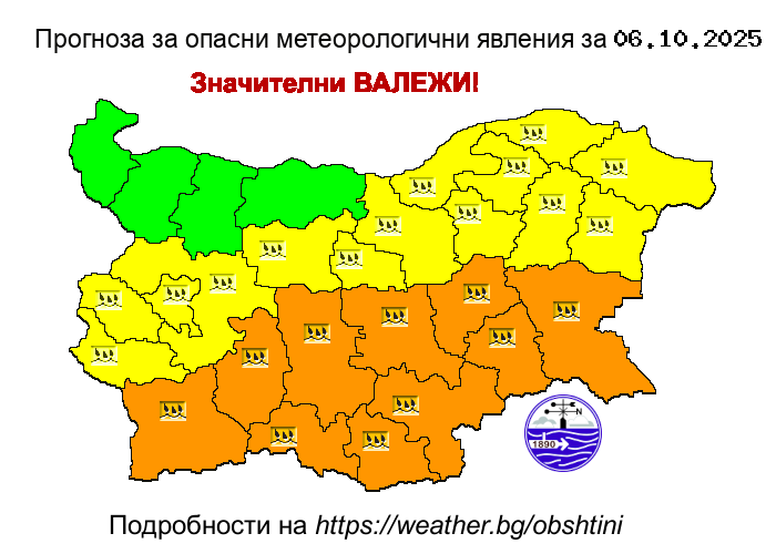 Днес, 6 октомври, България е под влияние на мощен средиземноморски циклон, който ще донесе значителни валежи и понижение на температурите. Националният институт по метеорология и хидрология обяви оранжев код за интензивни дъждове в 10 области на Южна България, а в други 14 области е в сила жълт код за потенциално опасно време. Само четири северозападни области – Видин, Монтана, Враца и Плевен – остават извън предупрежденията.